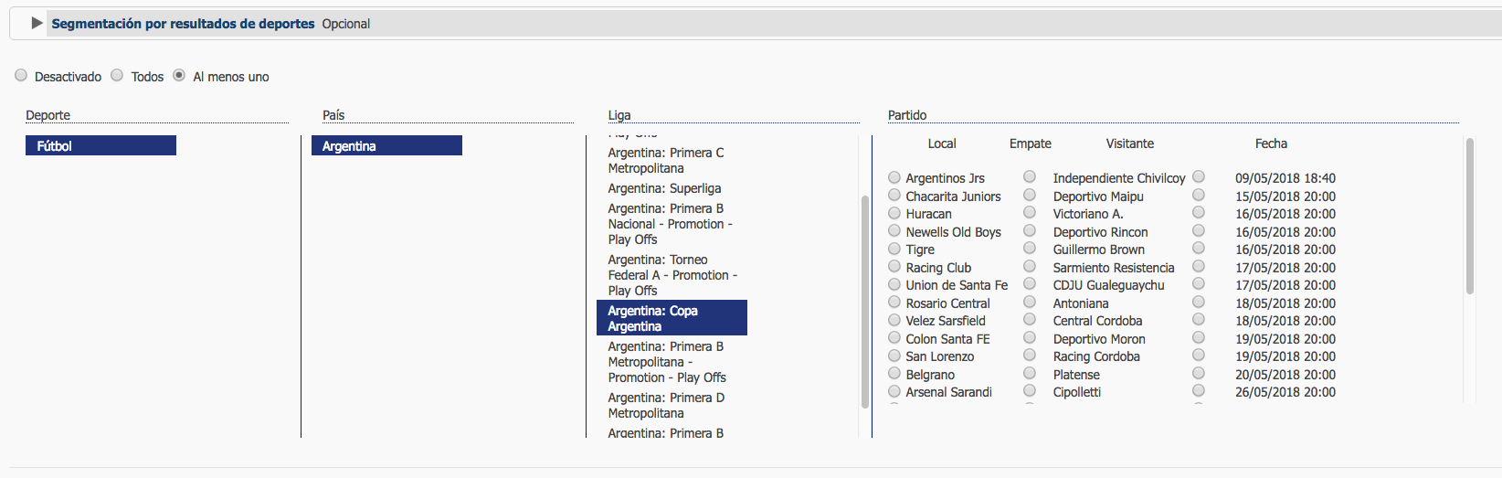 Implementarla en un anuncio o una campaña es muy simple, solo es necesario ingresar a la opción correspondiente en el formulario y seleccionar los encuentros que nos interesen. Luego, seleccionar en que caso debería mostrarse el anuncio: si el equipo local se encuentra ganando (o ganó el encuentro en caso de que haya finalizado), si se encuentra ganando el visitante o si se encuentran empatados.